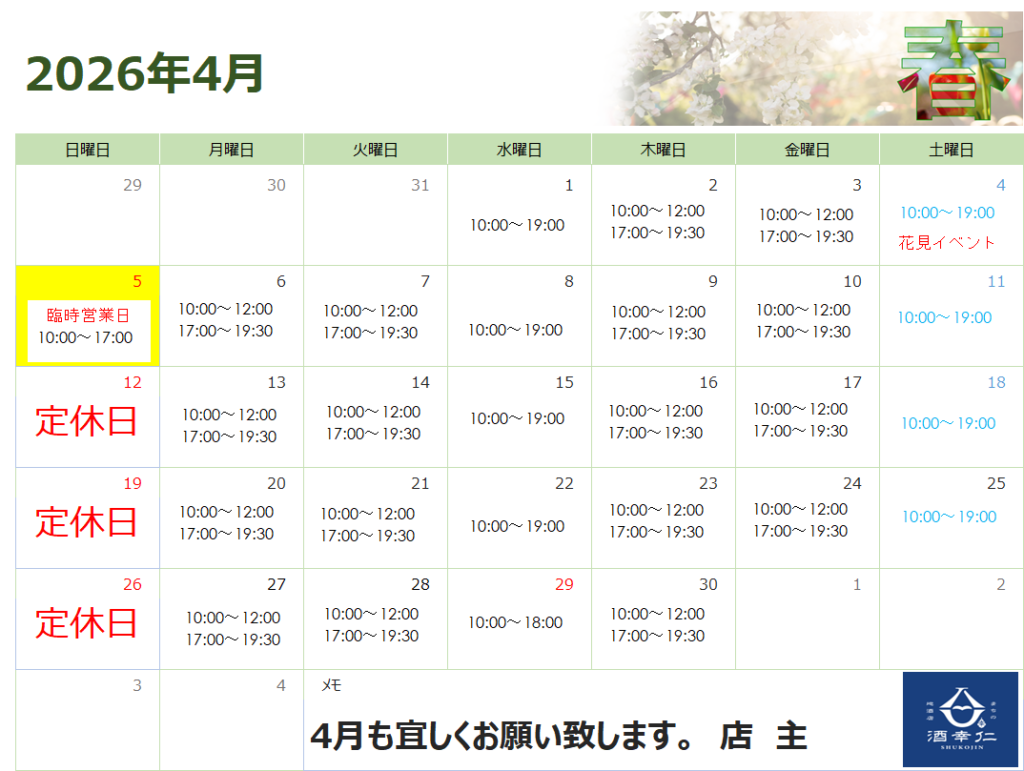 令和8年 4月 営業カレンダー