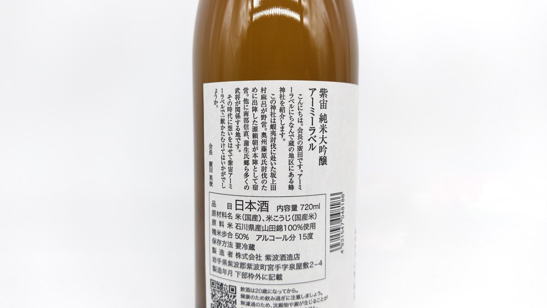 酒米の王様と呼ばれる『山田錦』で醸した純米大吟醸。山田錦の持つ芳醇な香りと心地よい余韻は、まさに日本酒の最前線を進む味わい、まさにアーミーラベル!