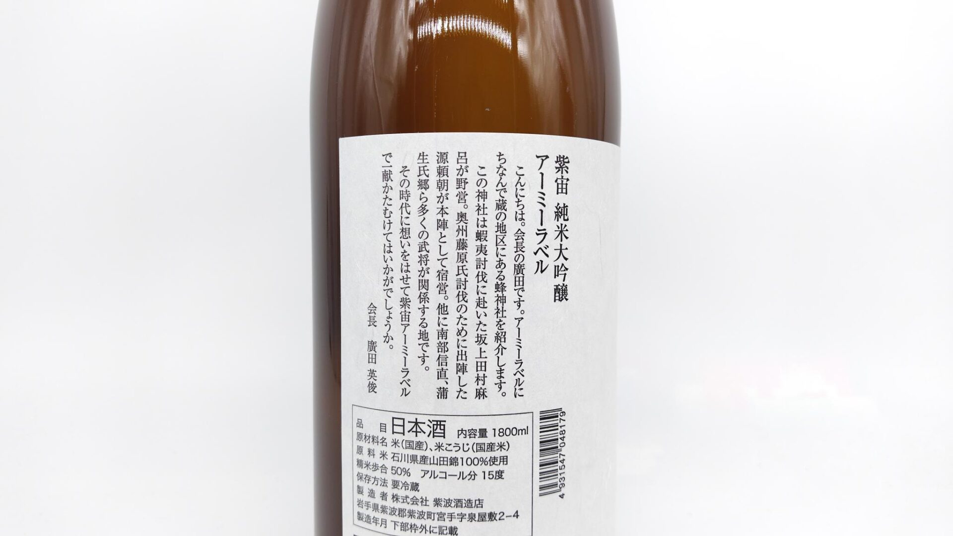 酒米の王様と呼ばれる『山田錦』で醸した純米大吟醸。山田錦の持つ芳醇な香りと心地よい余韻は、まさに日本酒の最前線を進む味わい、まさにアーミーラベル!